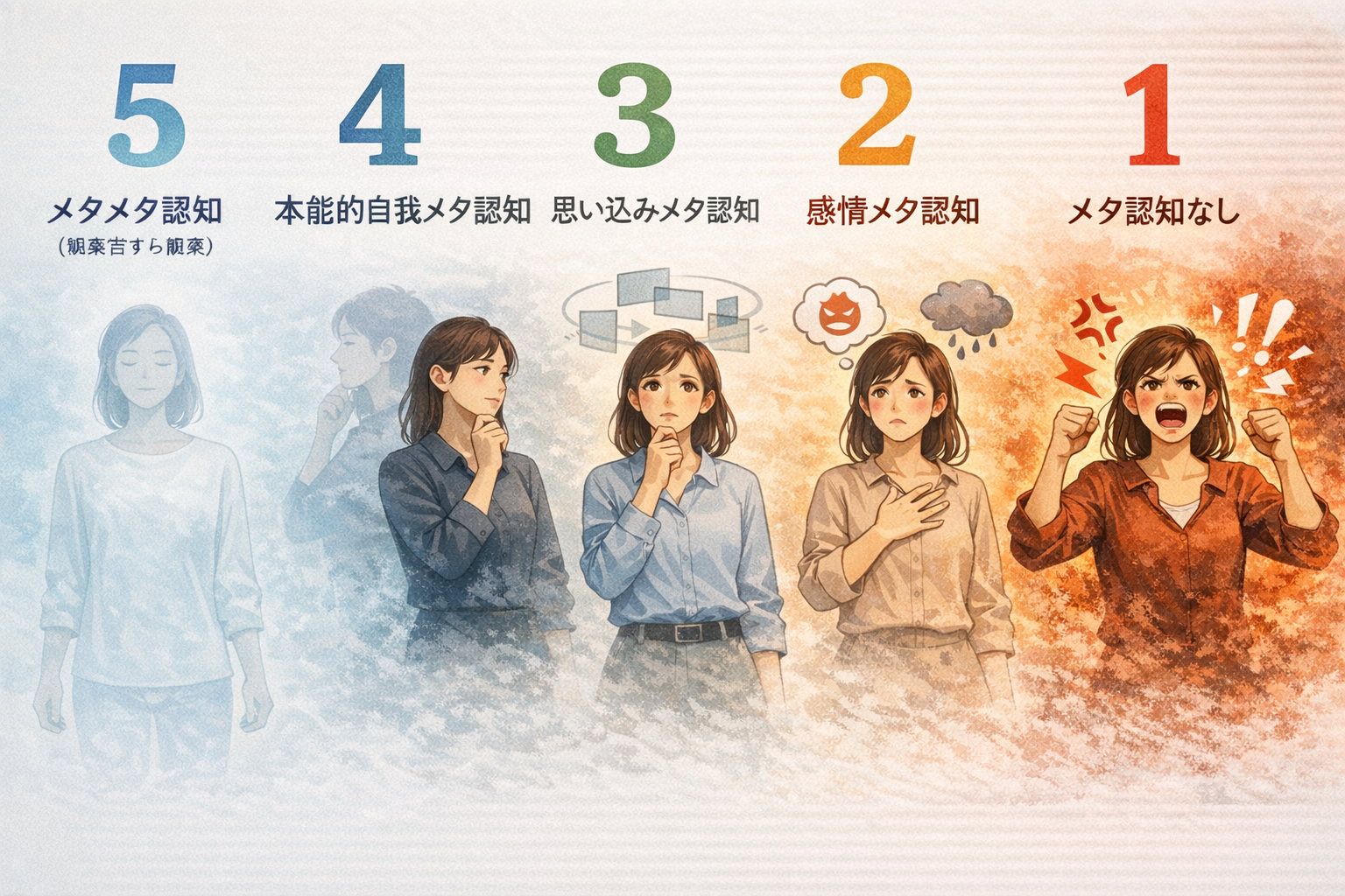 人間の【メタ認知の進化段階】は、ざっくり、次の五つの層で進化していきます。